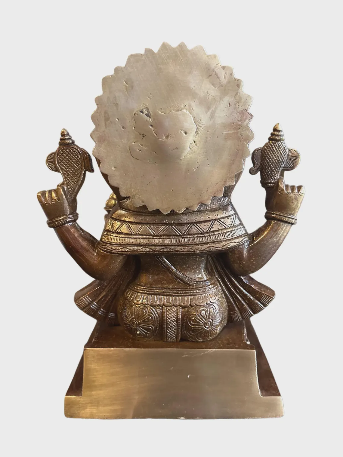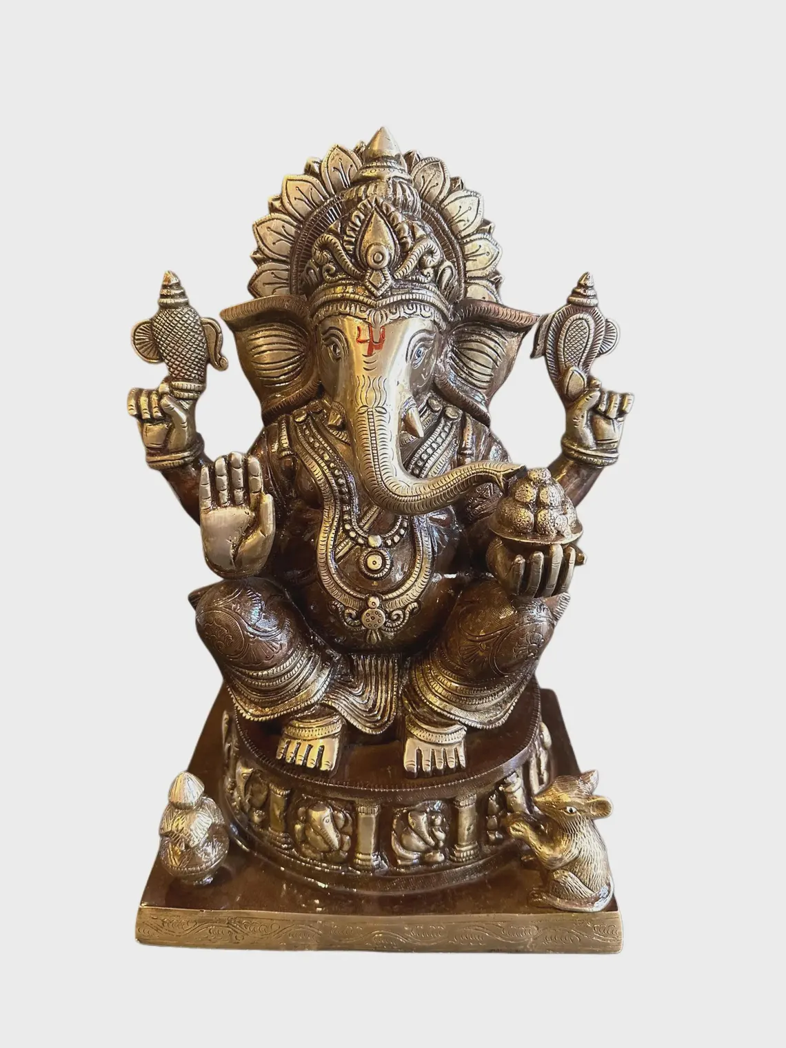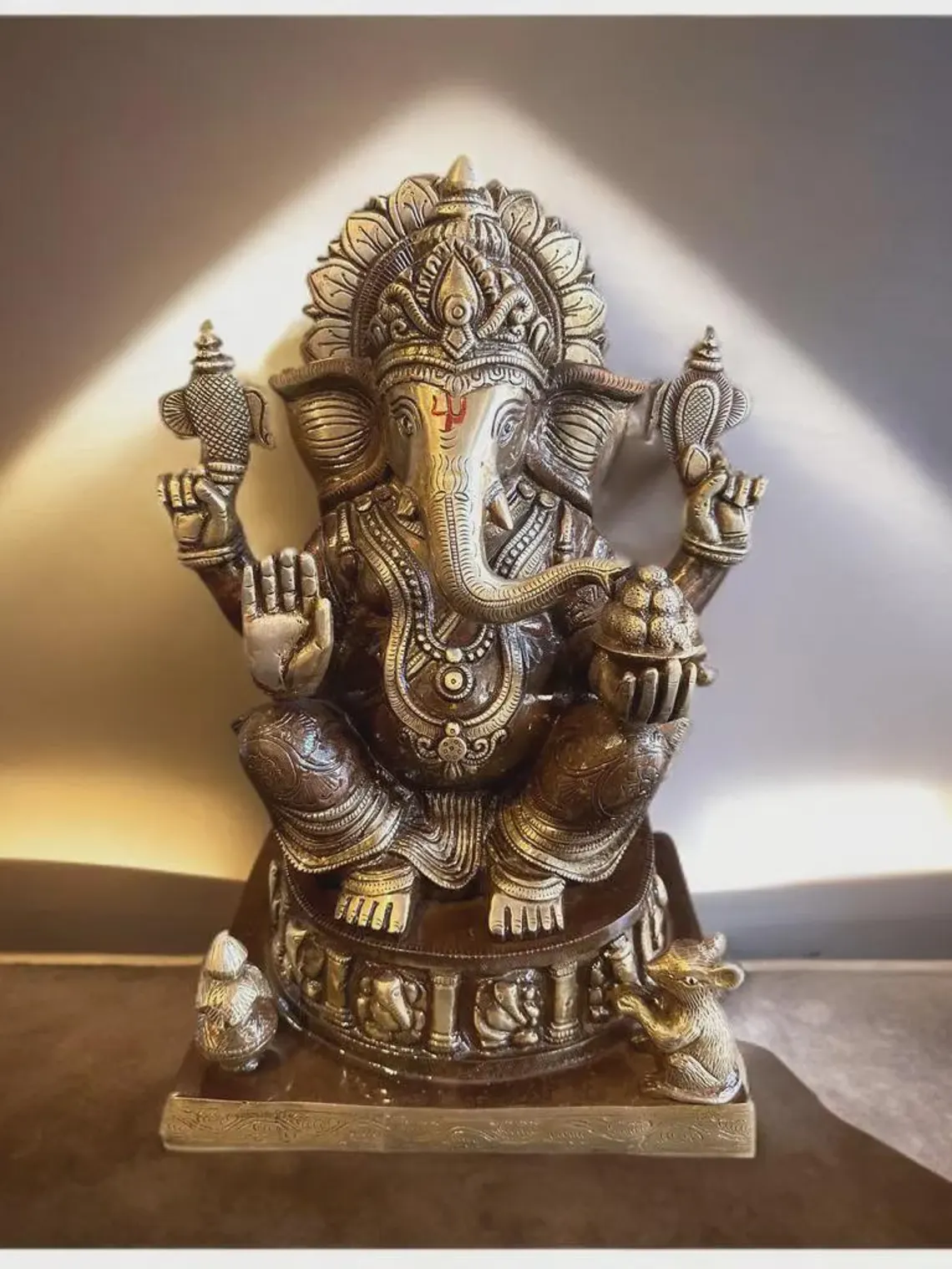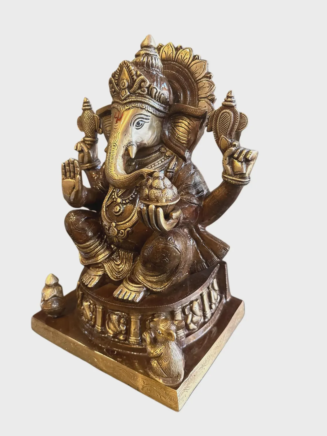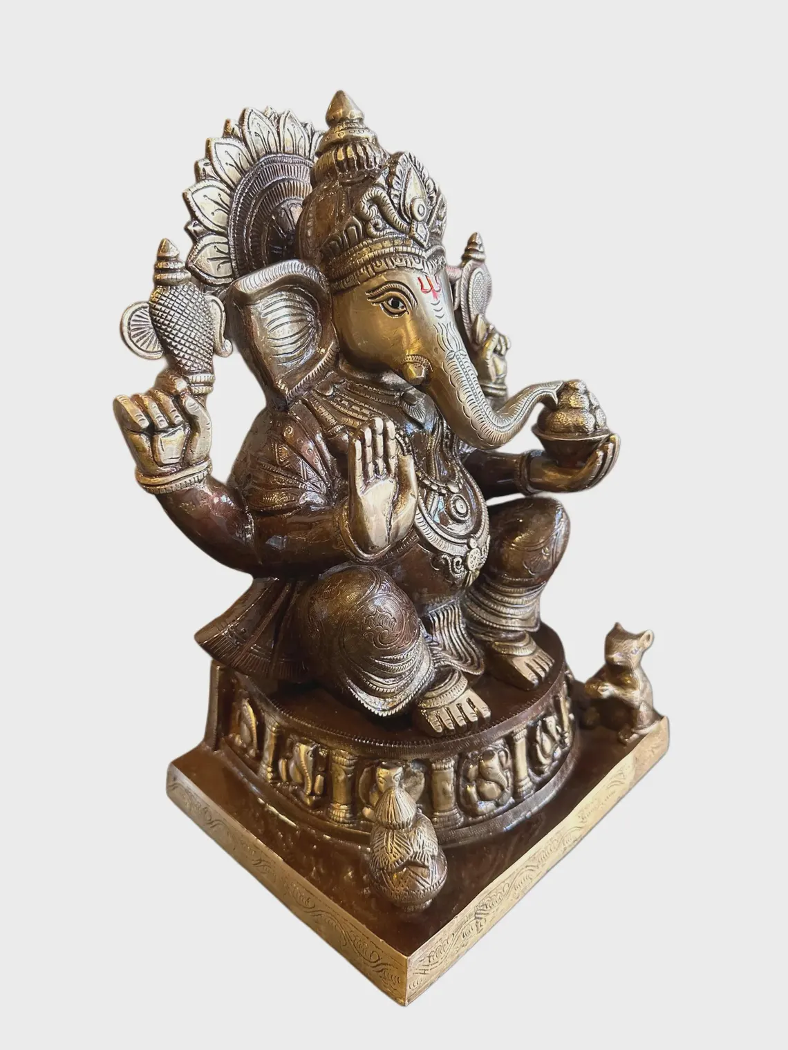 • Design: Lord Ganesha seated majestically on an ornate base, holding traditional symbols with one hand raised in blessing and his vahana (mouse) at the front, representing prosperity, protection, intellect, and removal of obstacles.